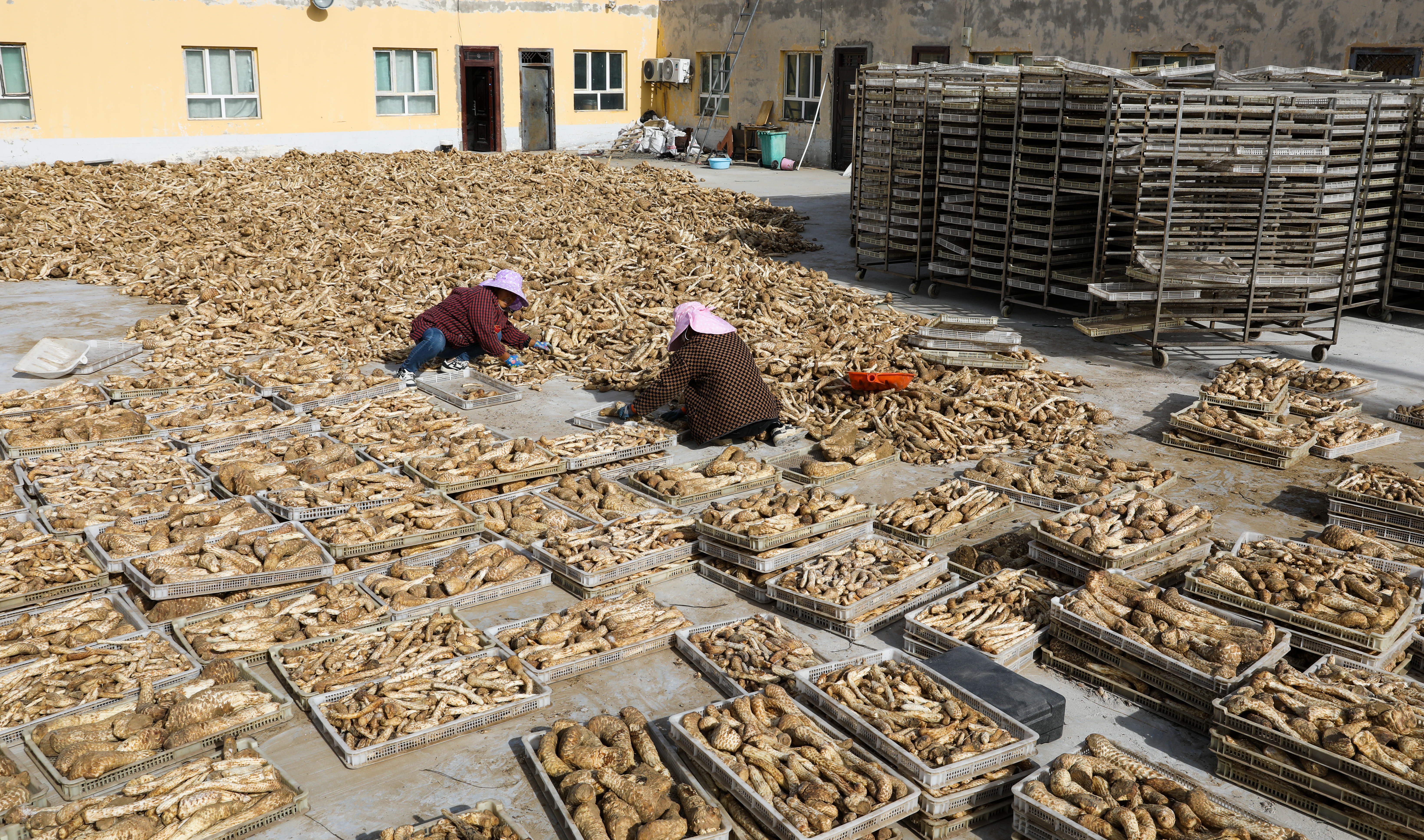 苁蓉小镇员工正在晾晒肉苁蓉。许晓龙 摄
