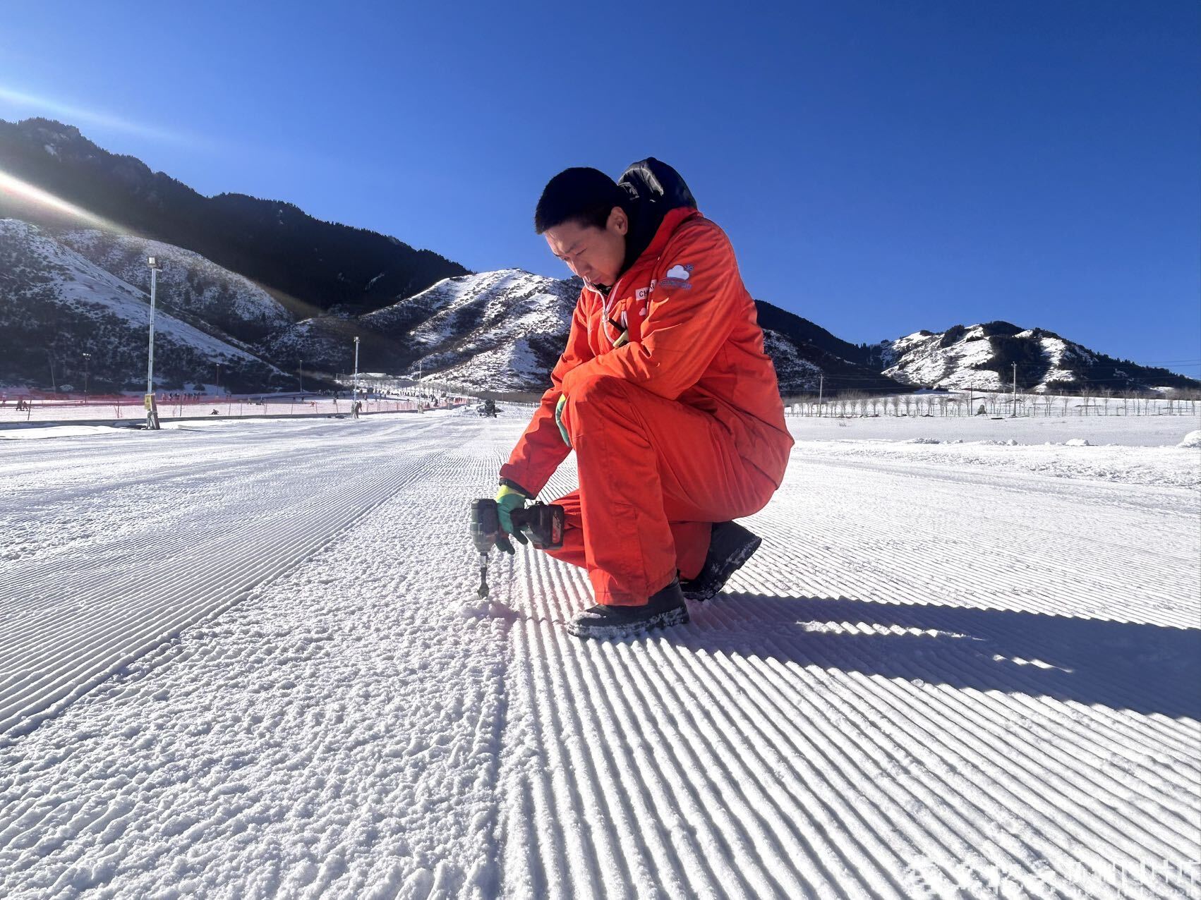 11时,阳光洒在雪道上,各色滑雪服的身影交织流动,欢声笑语在冷冽的空气中格外清脆。另一边还未开放的雪道上,一抹橙色的身影格外醒目。压雪机早晨刚压过的雪道上,是雪友们喜欢的“面条雪”,李彦周拿着雪钻在不同的位置探入雪道测试积雪厚度,30厘米左右的厚度是开放的硬标准。“这条初级教学道也达到标准,刚好赶上放雪假的娃娃们来滑。”李彦周说。