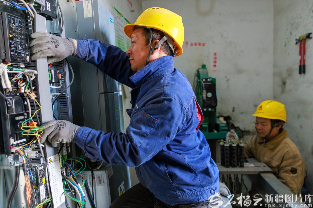 2025年11月20日,专业维保人员在乌鲁木齐市天山区新华南路街道四桥社区一住宅小区的电梯机房里安装控制柜线路。孙振嵩 摄
