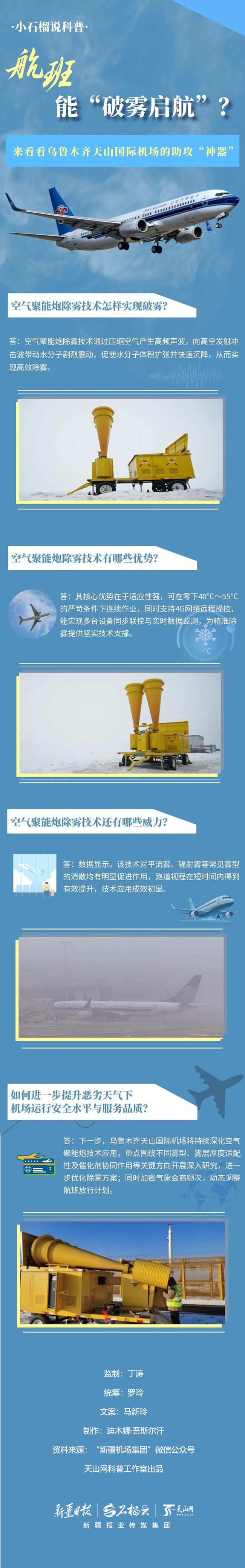 冬季冻雾、局地浓雾,一直困扰着机场航班正常起降。为攻克这一难题,近日,新疆机场集团乌鲁木齐天山国际机场确定了空气聚能炮除雾技术的应用方案。空气聚能炮除雾技术是怎样实现破雾的?其核心优势是什么?还有哪些威力?跟着《小石榴说科普》一起来了解。