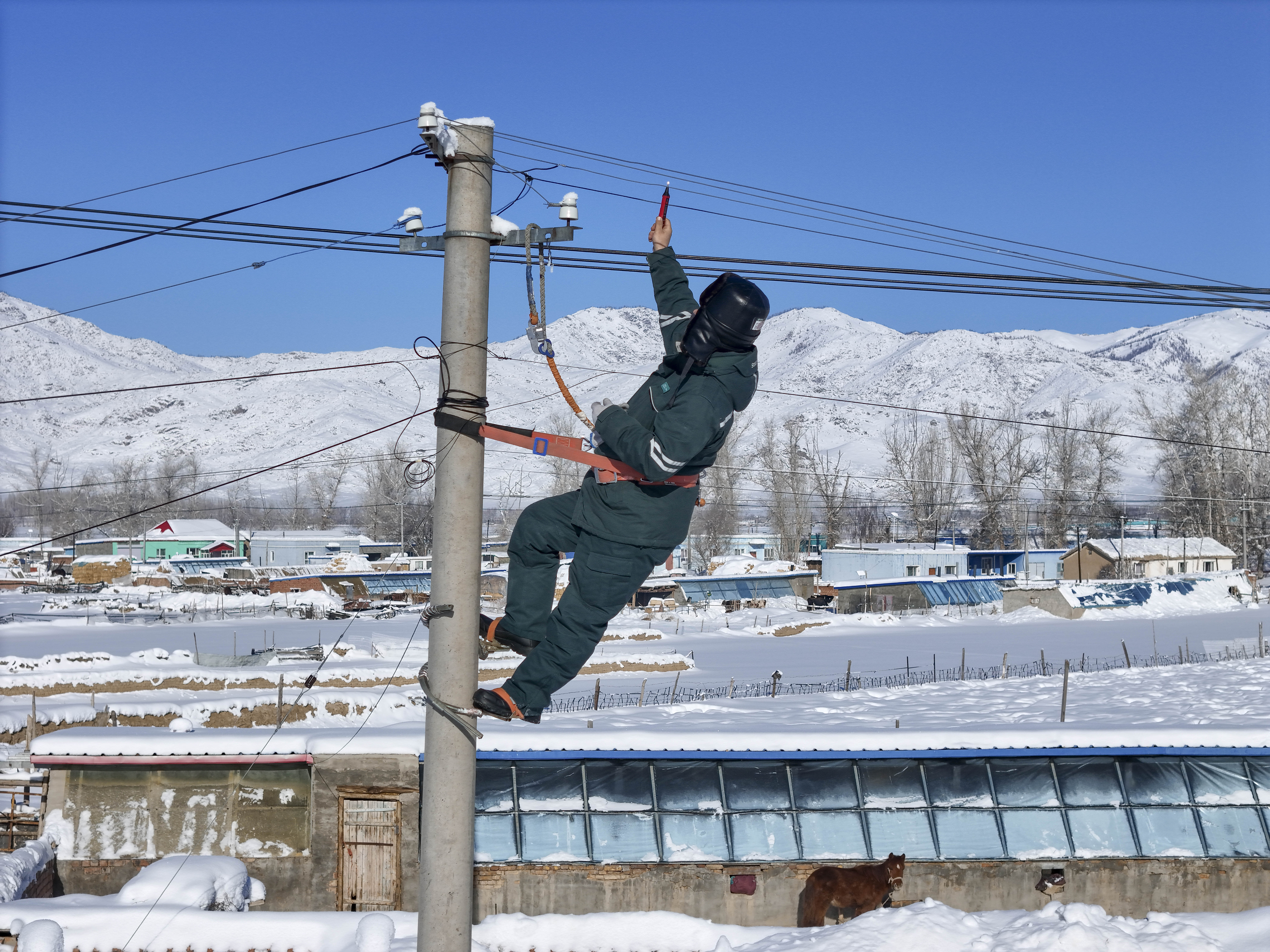 1月16日,吐尔洪乡供电所员工在巡检路上。新华社发(努尔别克·努尔曼 摄)