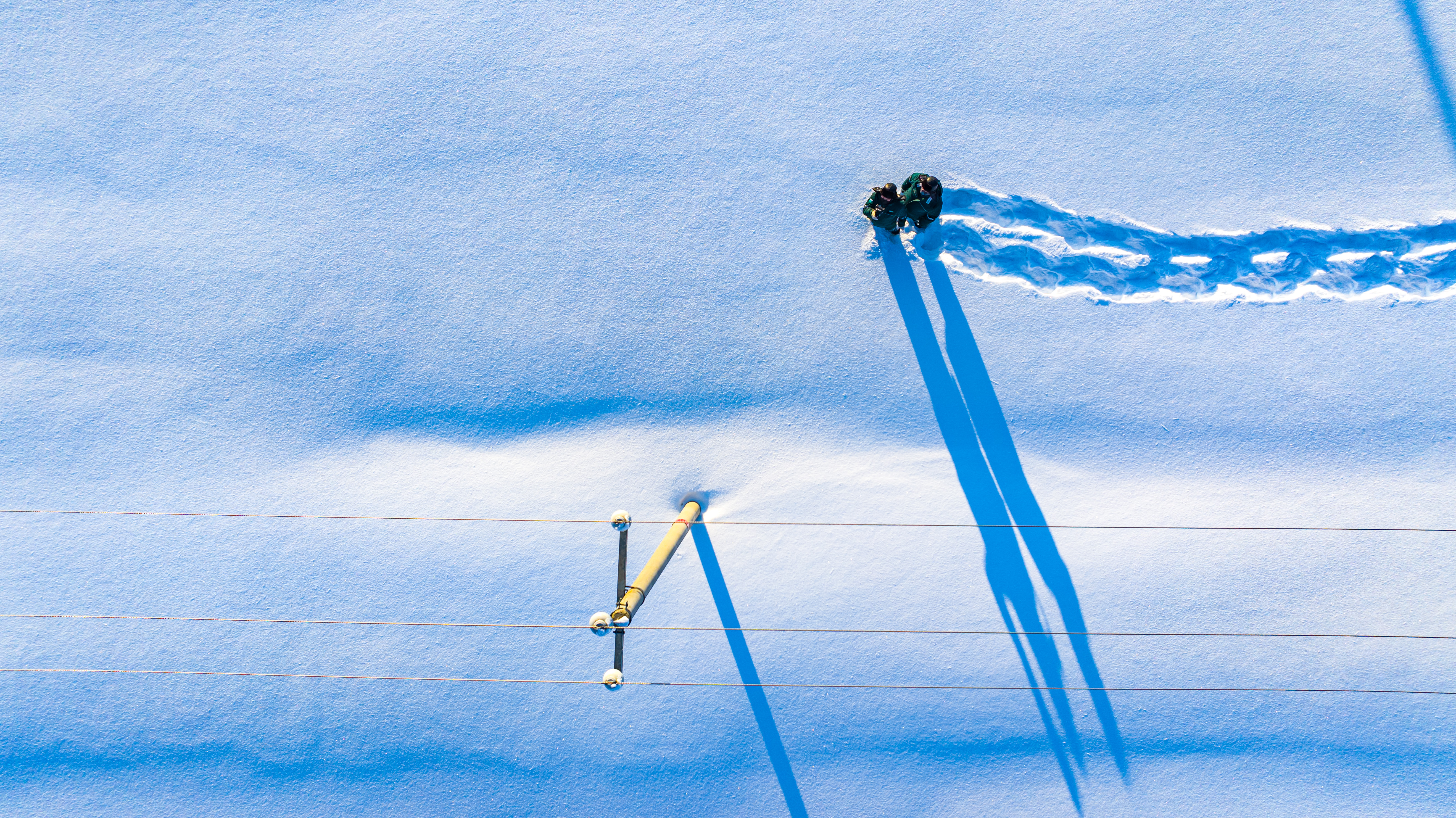 1月16日,吐尔洪乡供电所员工在检修故障线路(无人机照片)。新华社记者 胡虎虎 摄