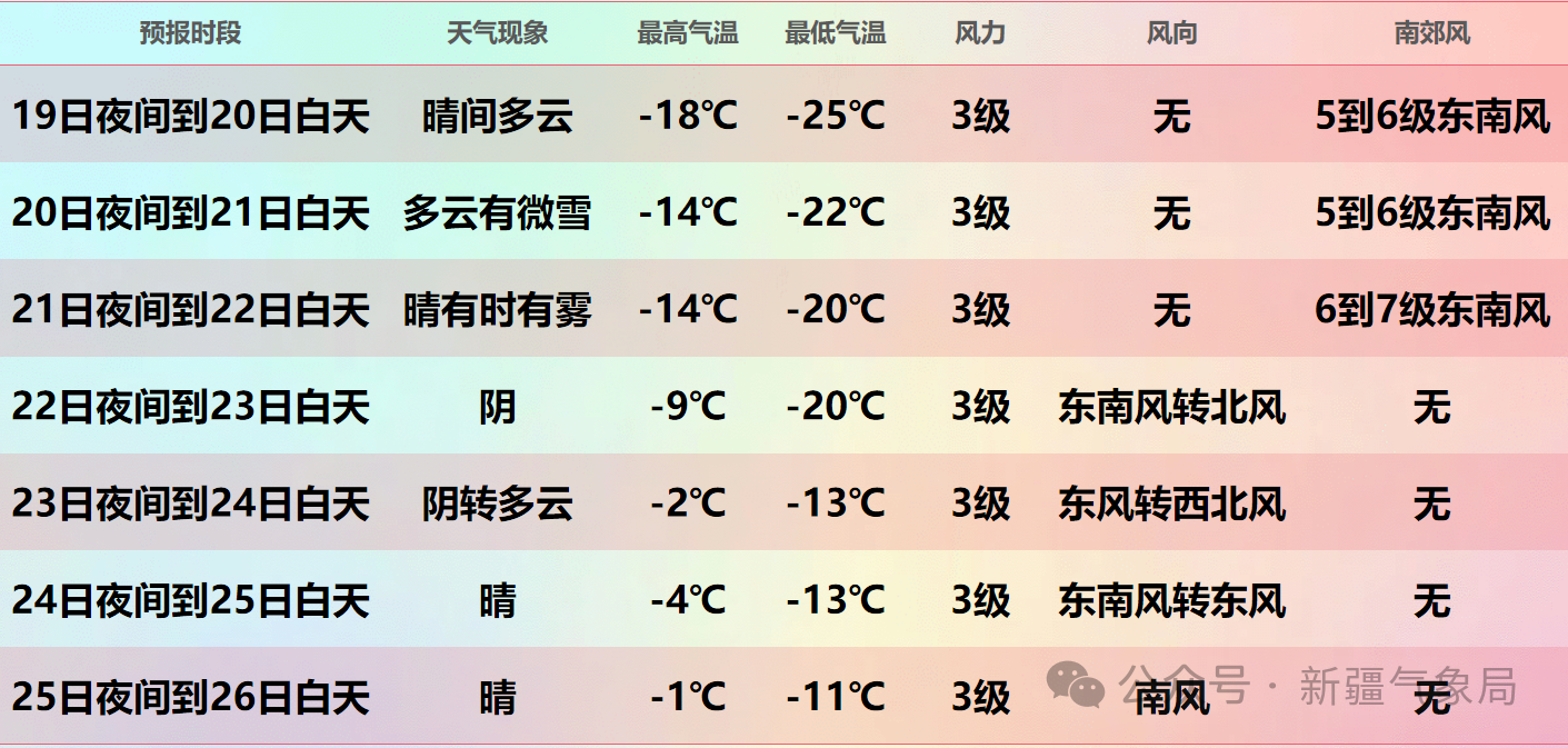 预报显示,本周,乌鲁木齐城区低温-25℃~-11℃,高温-18℃~-1℃。而随着寒潮天气离开,从1月23日起,乌鲁木齐最高温会逐步回升至-10℃左右,周末有望回升至-2℃左右。