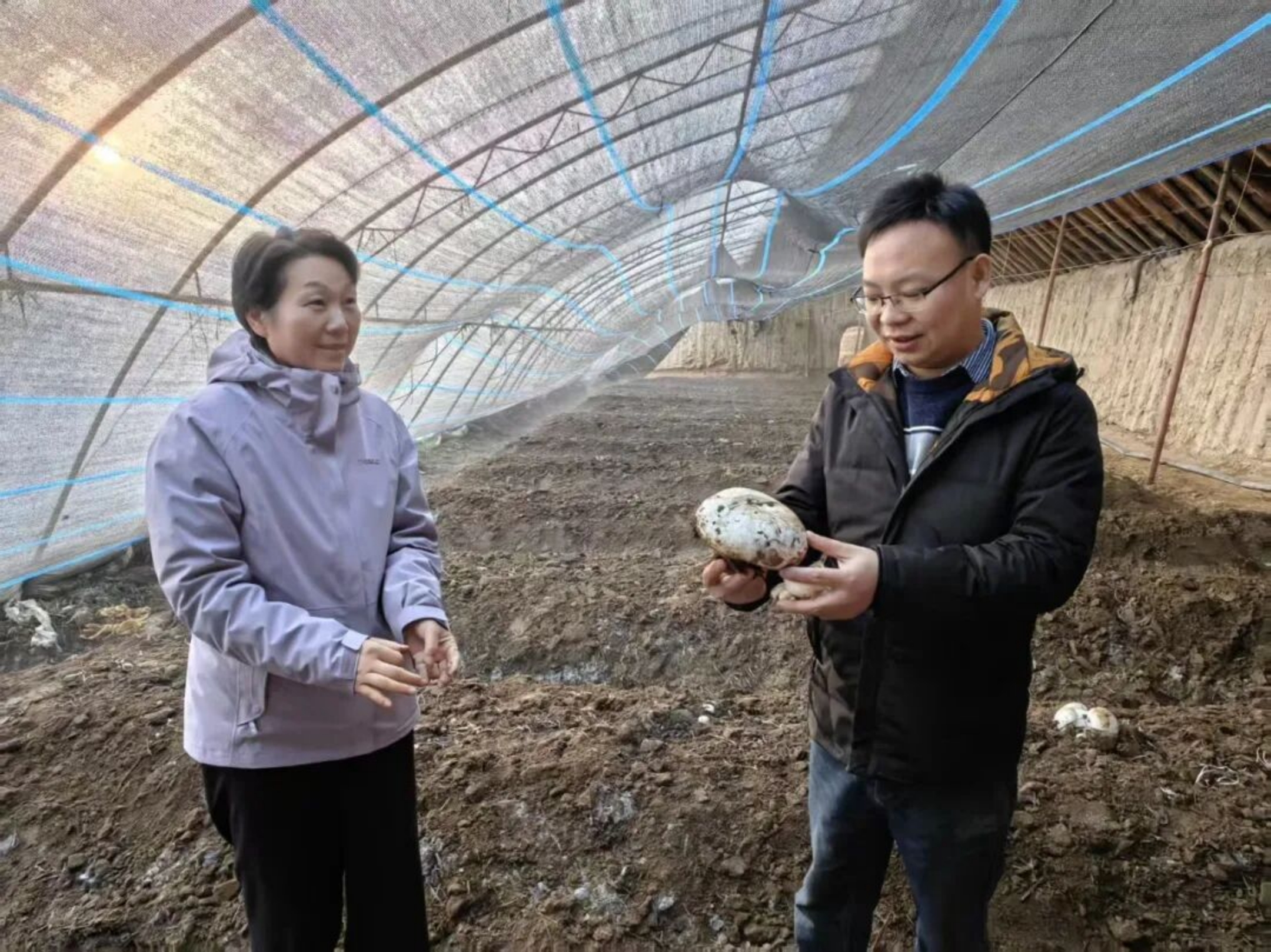 当日下午,孔维丽一行走进一座座温室大棚,俯身细看菌丝长势、土壤湿度及子实体发育状况,为食用菌生长“把脉问诊”。