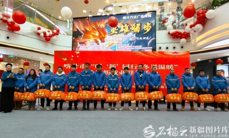喀什市“暖‘新’通行冬送温暖 关爱新就业群体”活动现场,为快递从业人员发放御寒棉被。喀什地区邮政管理局供图