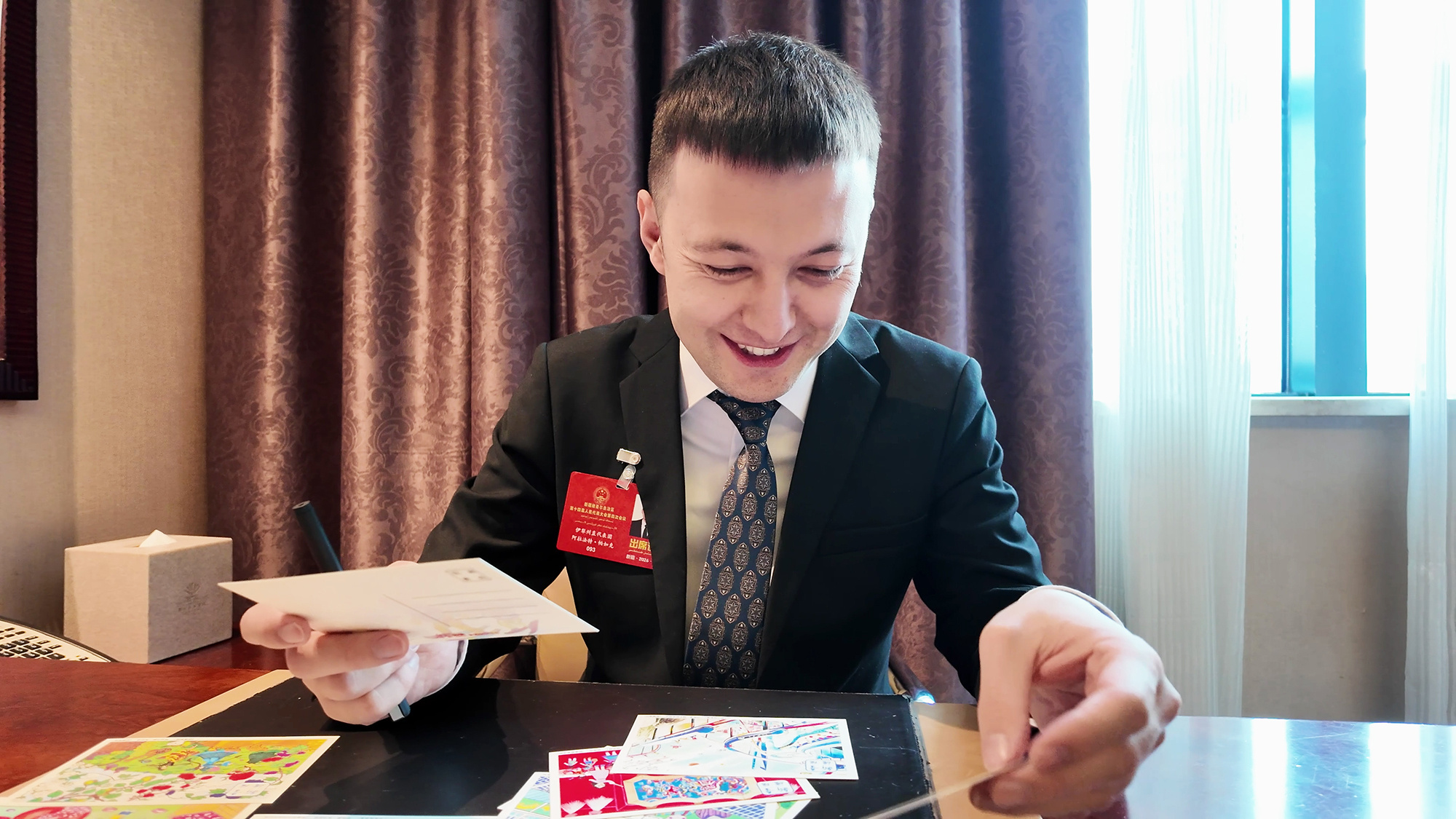 1月26日,参加新疆维吾尔自治区十四届人大四次会议的人大代表在欣赏“童绘新疆”明信片上的画作。(摄影:马海君)