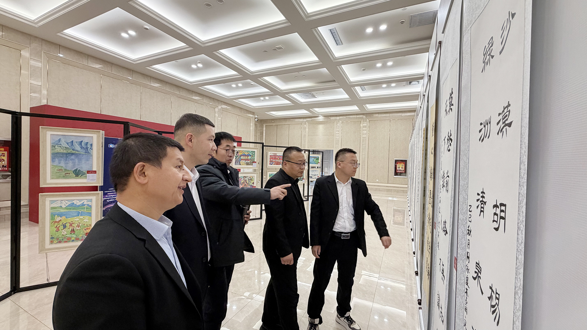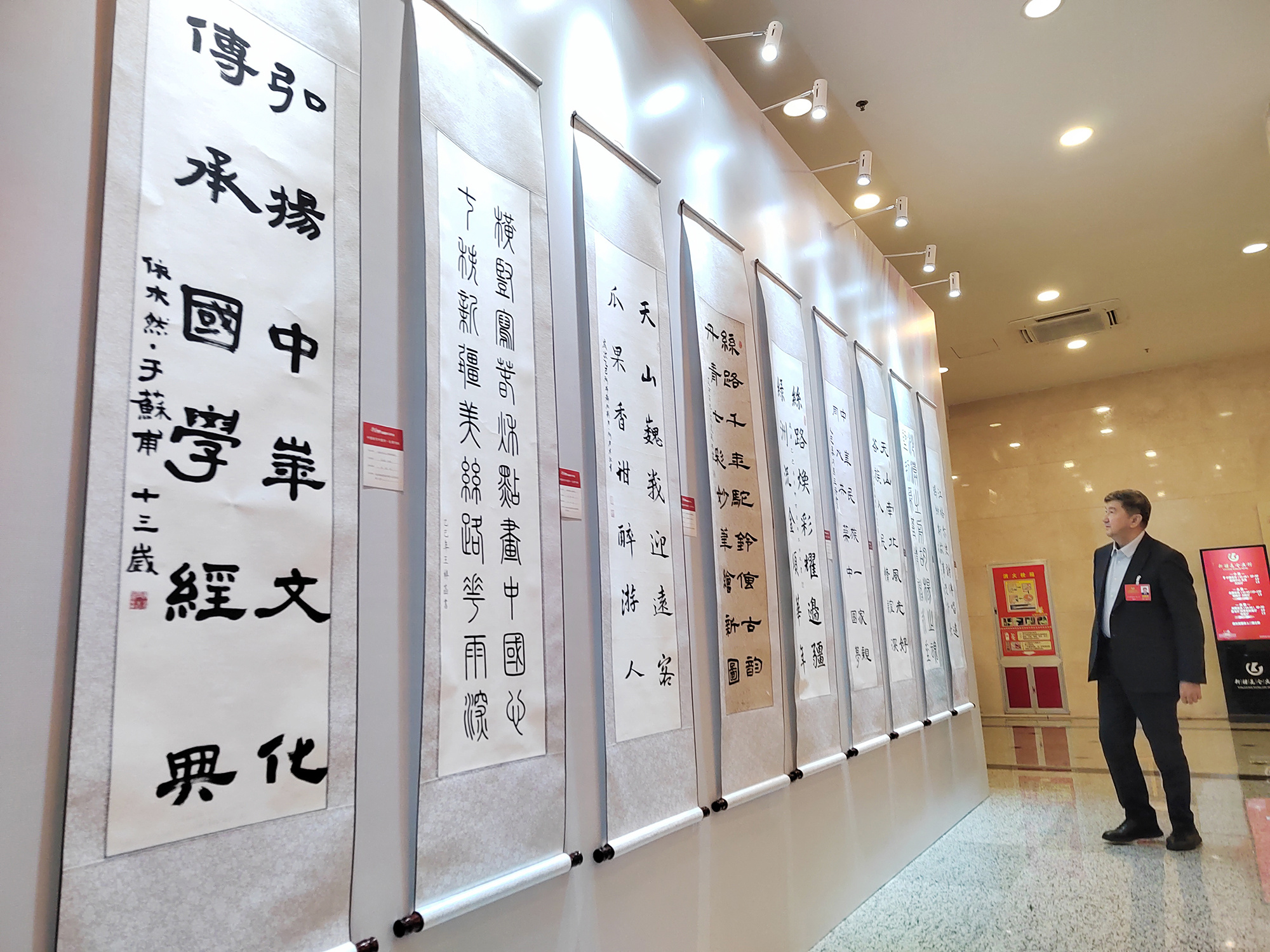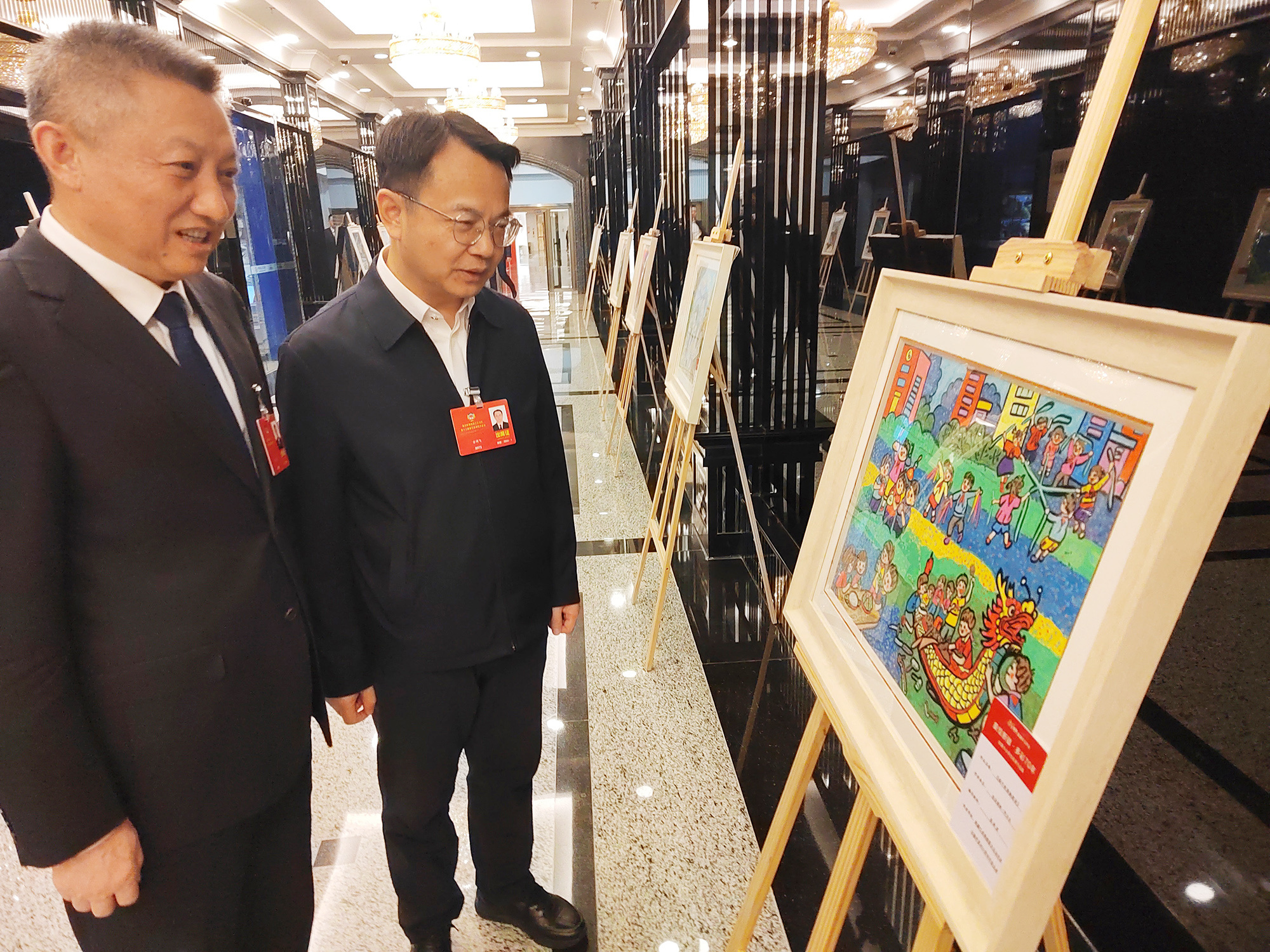 2026年新疆两会现场,“童绘新疆”“中国娃写中国字”书画作品成果展,吸引众多代表委员驻足欣赏。