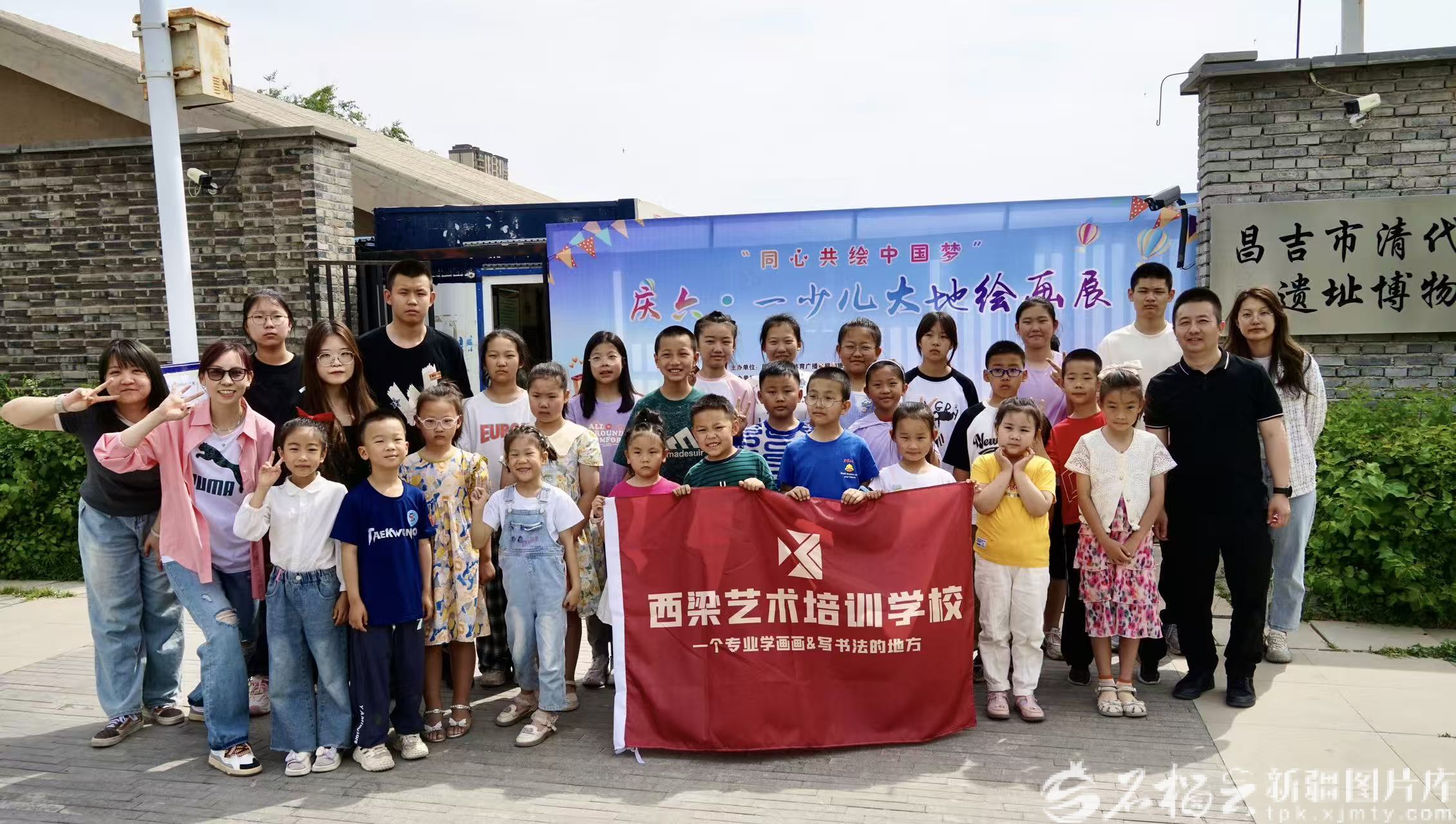 马文涛(右二)带领学生们在昌吉市清代粮仓遗址博物馆研学留影(资料图)。受访者供图