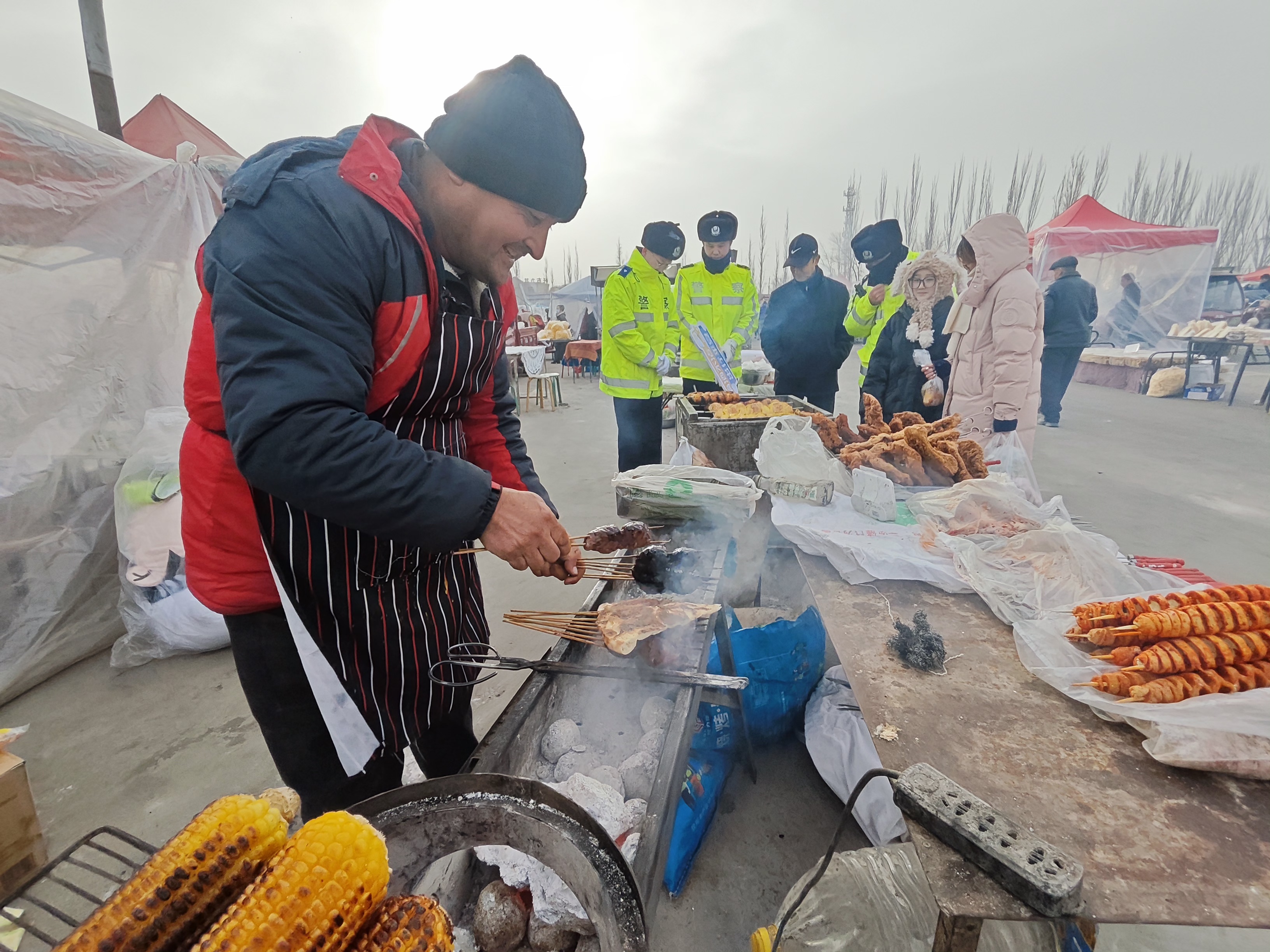 1月30日,民辅警在司拉木·买买提的烧烤摊前宣传交通安全知识。通讯员 严万海摄