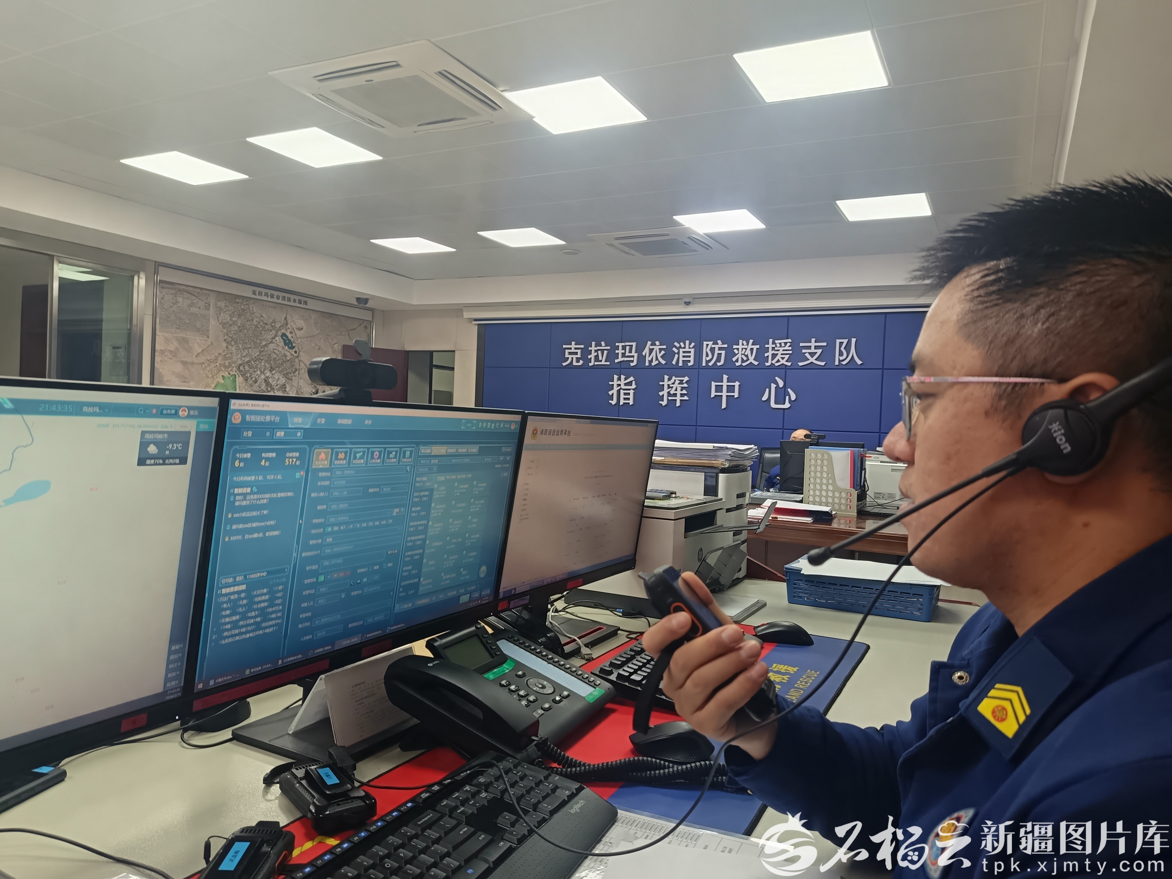 2月17日凌晨,接警调度员王成成正在克拉玛依市消防救援支队指挥中心值班。克拉玛依市消防救援支队供图