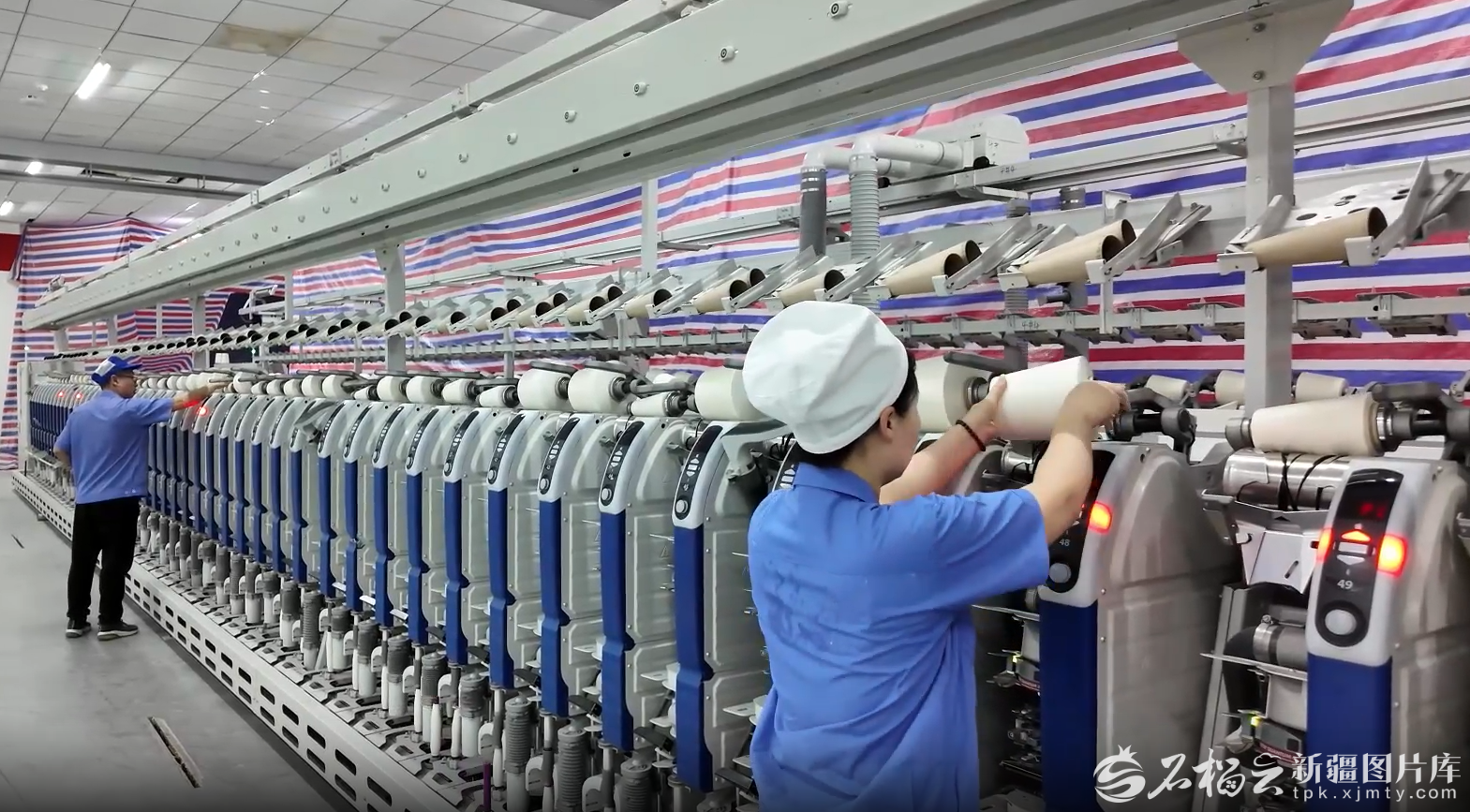 2月25日,在沙湾市海华(新疆)纺织有限公司生产车间,智能化纺纱设备高速运转,清花、梳棉、精梳、并条、粗纱、细纱、络筒等工序有条不紊地进行,新疆优质棉花经加工转化为高档精梳紧密纺纱线,工人认真作业,保障生产与品质。