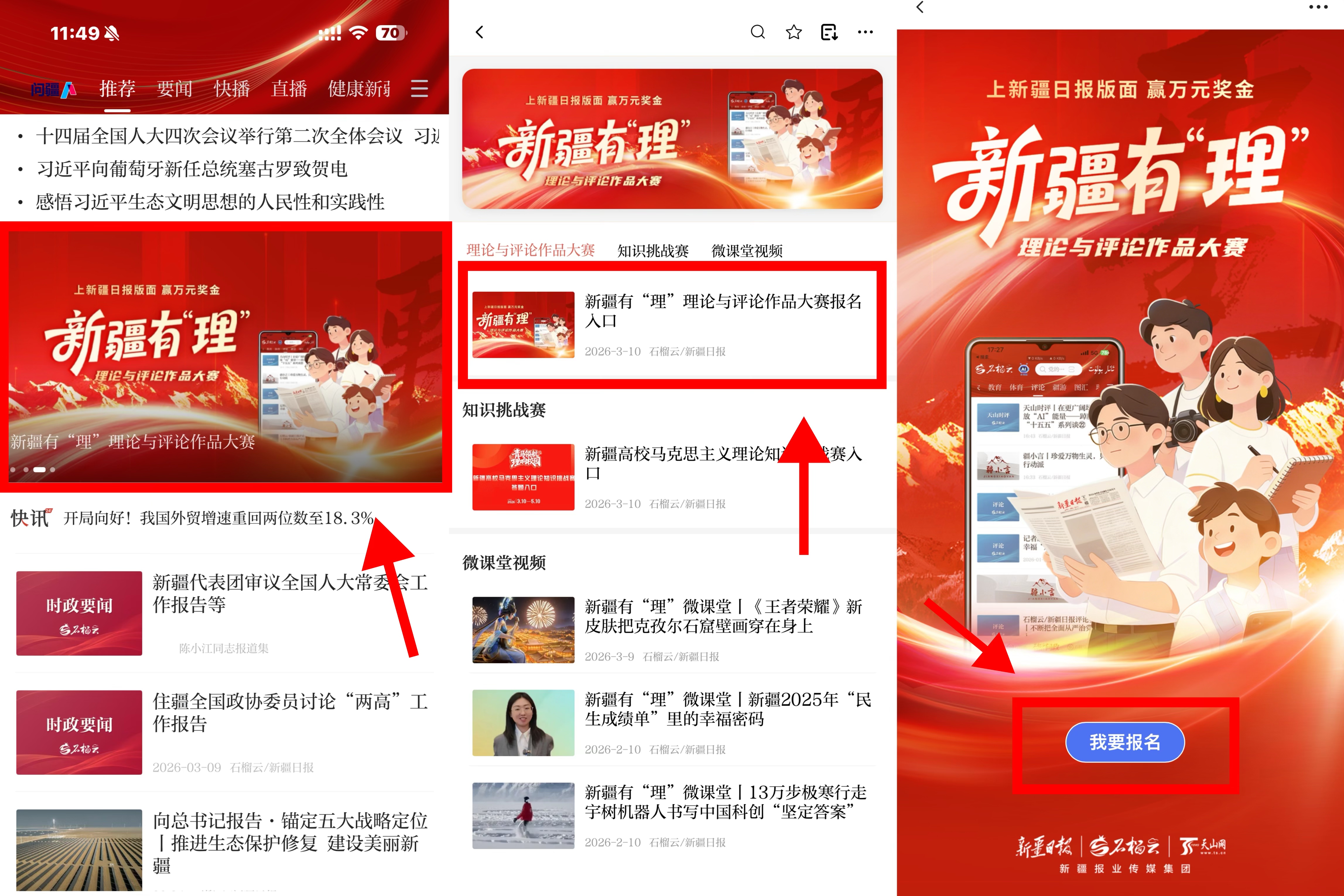(二)在首页轮播图找到新疆有“理”理论与评论作品大赛专题,选择新疆有“理”理论与评论作品大赛报名入口,点击进入后按要求填写相关信息。