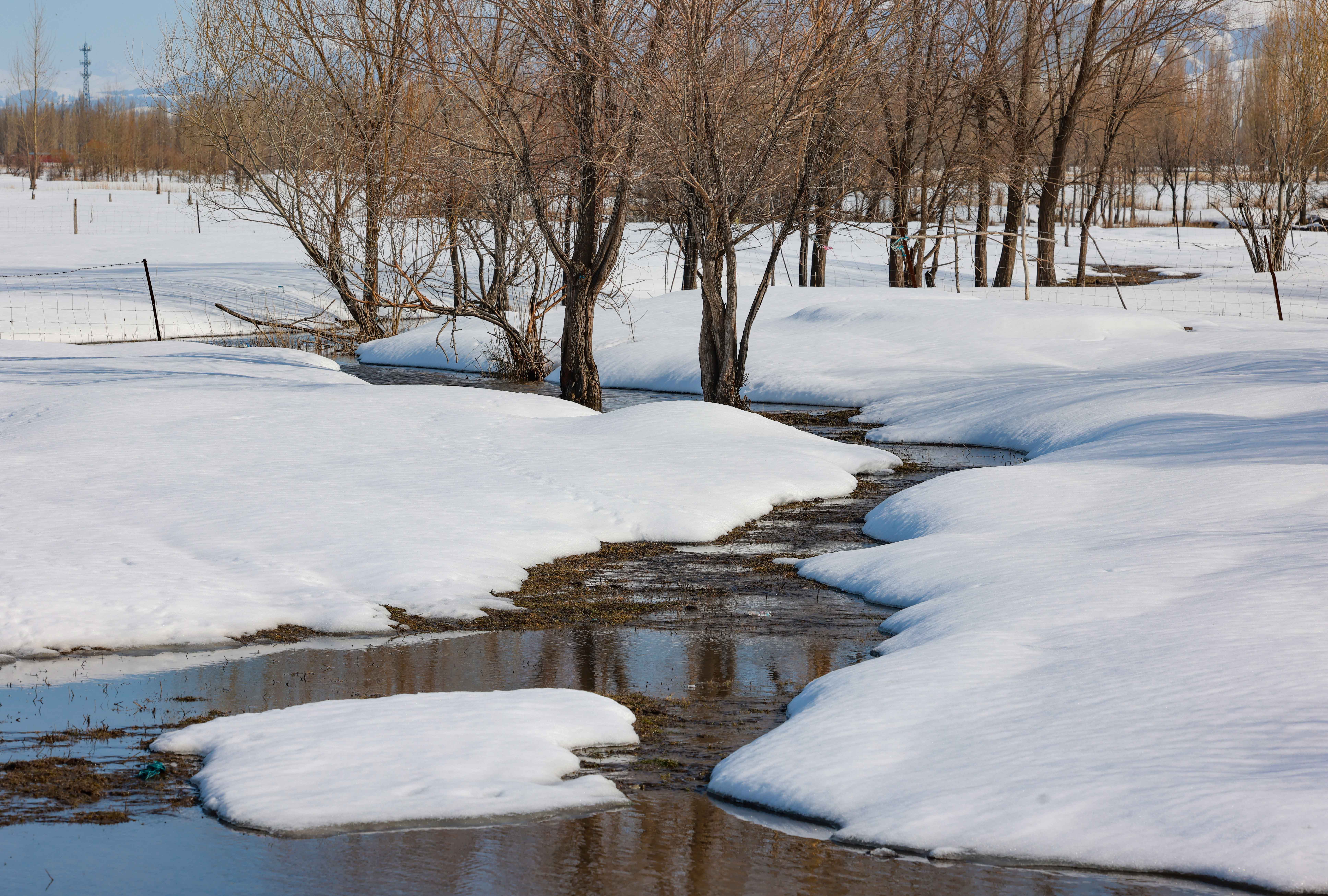 初春时节,新源县坎苏镇冰雪渐融,水系连通工程沿线迎来别样盛景。无人机高空俯瞰,融雪汇成的河流如银龙蜿蜒,在皑皑雪原上舒展身姿,千姿百态的水形,绘就出独具北疆特色的春日水韵。