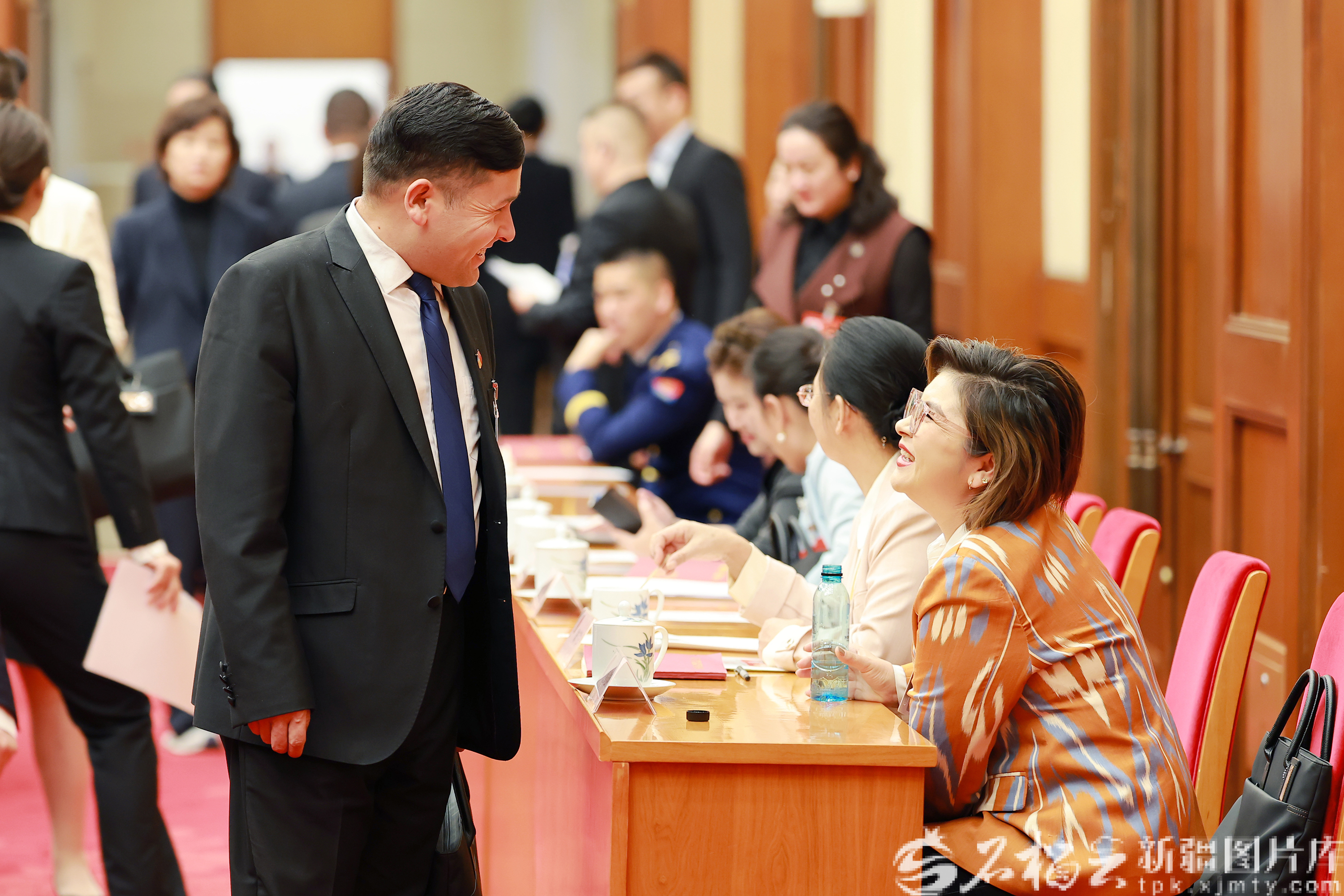 3月11日上午,十四届全国人大四次会议新疆代表团举行全体会议,继续审议全国人大常委会工作报告和最高人民法院工作报告、最高人民检察院工作报告。图为会前,阿卜迪麦麦提·奥布力代表(左)和如克亚木·麦提赛地代表在交流发言及建议内容。石榴云/新疆日报记者 崔志坚摄